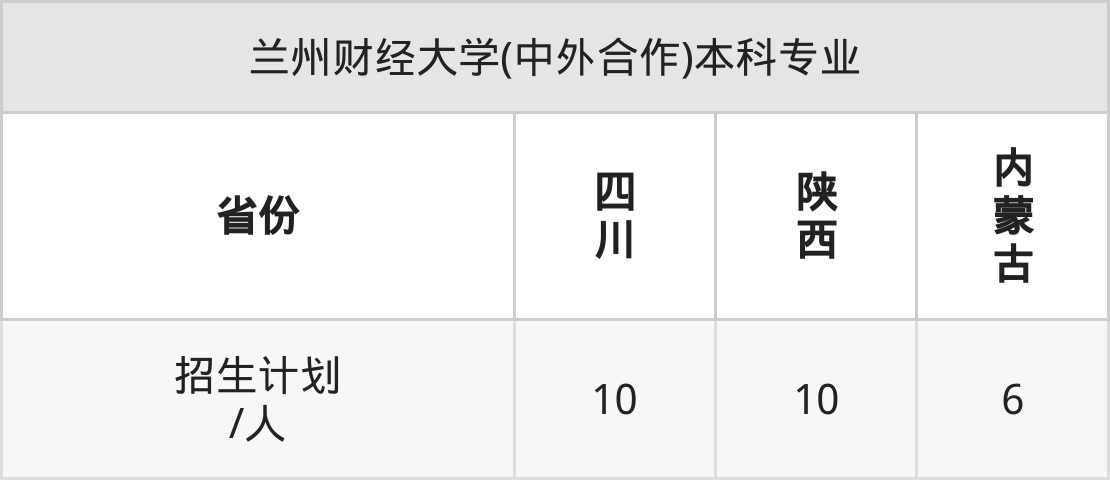 兰州财经大学(中外合作)面向四川(10人)、陕西(10人)、内蒙古(6人)开展本科招生。招生批次为本科二批。