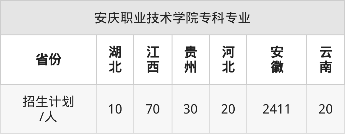 安庆职业技术学院面向湖北(10人)、江西(70人)、贵州(30人)、河北(20人)、安徽(2411人)、云南(20人)开展专科招生。招生批次为专科批。