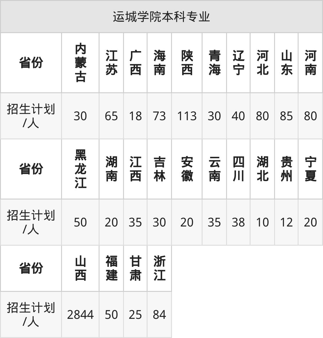 运城学院面向甘肃(25人)、四川(38人)、贵州(12人)、广西(18人)、陕西(113人)、内蒙古(30人)、黑龙江(50人)等24个地区开展本科招生。其中山西招生批次为第二批本科B类,河南、内蒙古、陕西、四川招生批次为本科二批,其余省份为本科批。