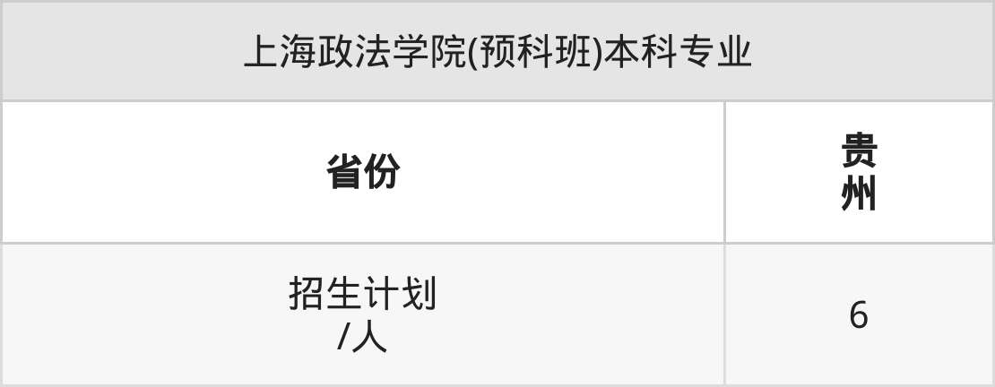 上海政法学院(预科班)面向贵州(6人)开展本科招生。招生批次为本科批。