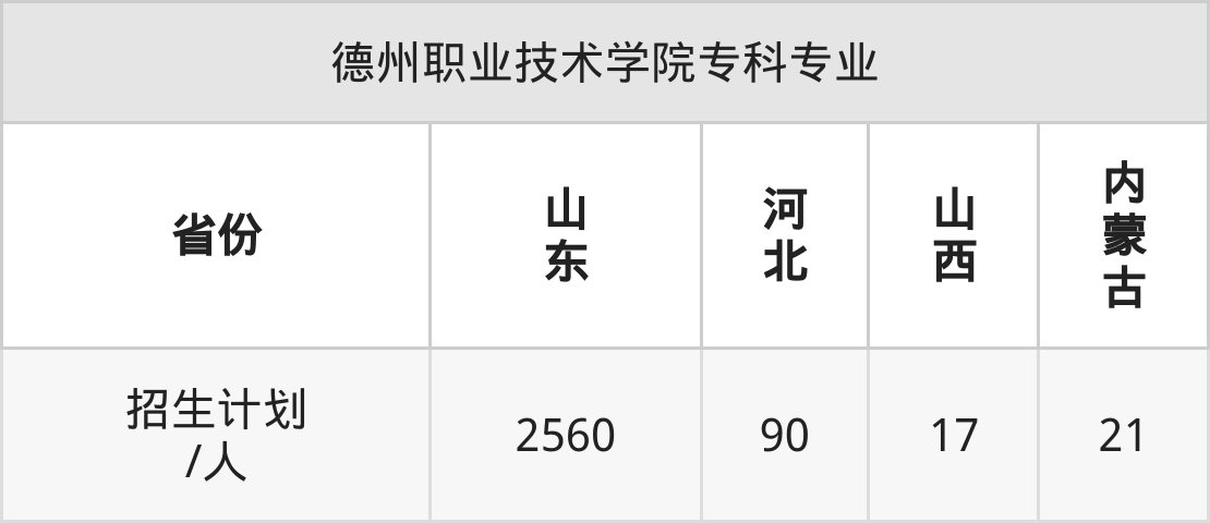 德州职业技术学院面向山东(2560人)、河北(90人)、山西(17人)、内蒙古(21人)开展专科招生。其中山东招生批次为二段,其余省份为专科批。