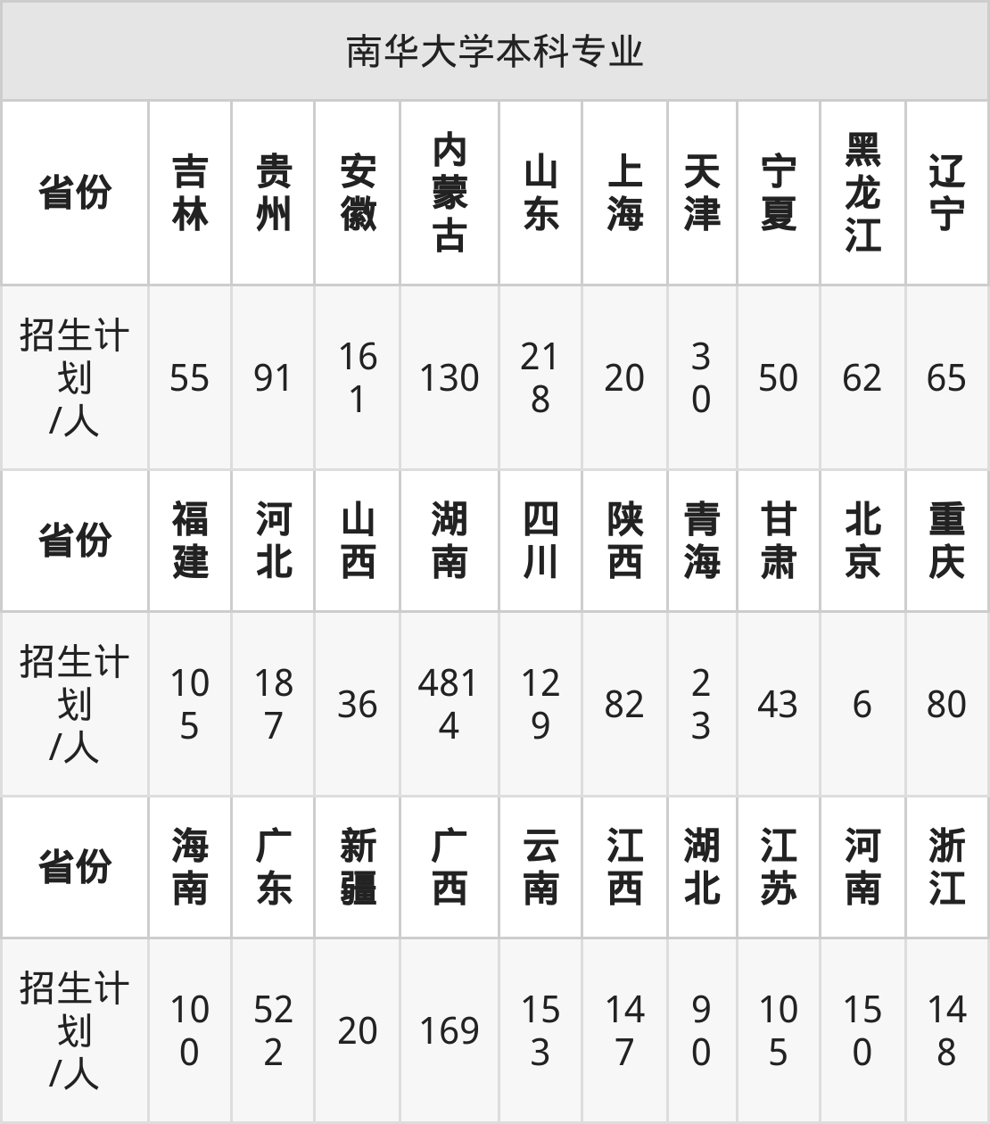 南华大学面向安徽(161人)、内蒙古(130人)、广西(169人)、湖南(4814人)、海南(100人)、重庆(80人)、河北(187人)等30个地区开展本科招生。其中山西招生批次为第一批本科B类,四川、新疆、内蒙古、陕西、河南招生批次为本科一批,其余省份为本科批。