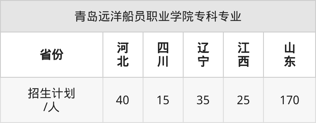 青岛远洋船员职业学院面向河北(40人)、四川(15人)、辽宁(35人)、江西(25人)、山东(170人)开展专科招生。其中山东招生批次为二段,其余省份为专科批。