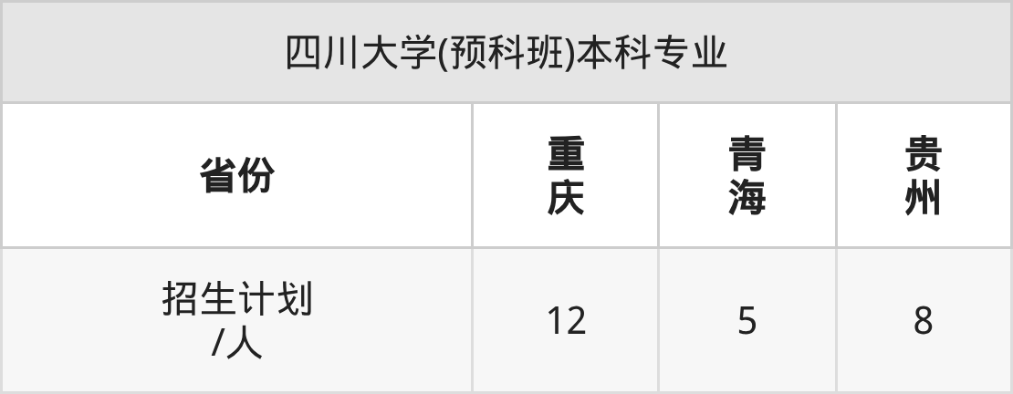 四川大学(预科班)面向重庆(12人)、青海(5人)、贵州(8人)开展本科招生。招生批次为本科批。