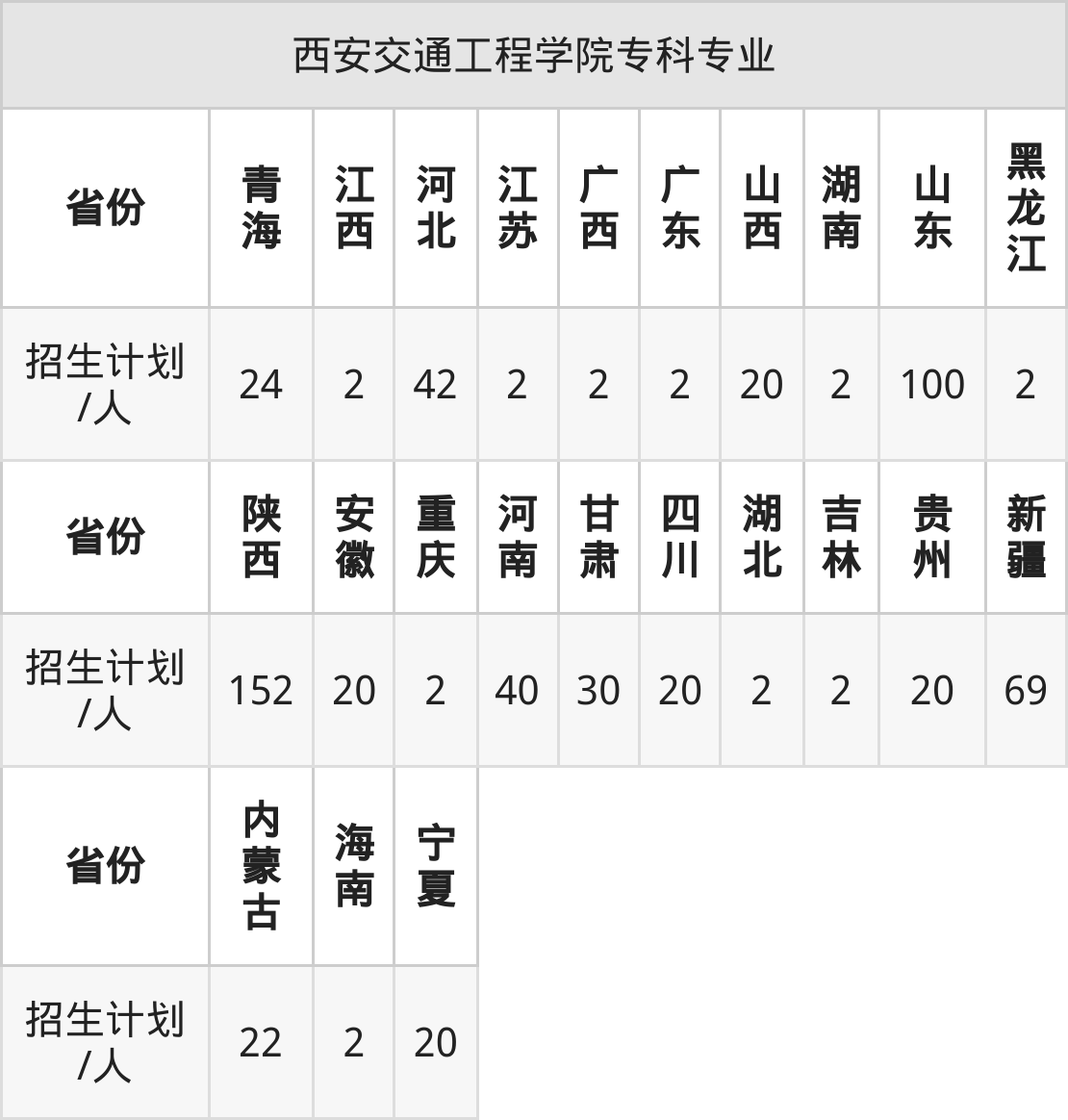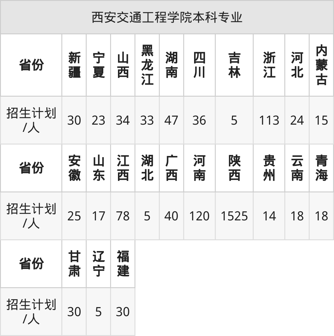 西安交通工程学院面向山西(34人)、新疆(30人)、内蒙古(15人)、湖北(5人)、河北(24人)、四川(36人)、广西(40人)等23个地区开展本科招生。其中青海招生批次为本科二段,四川、新疆、内蒙古、河南、陕西招生批次为本科二批,其余省份为本科批。