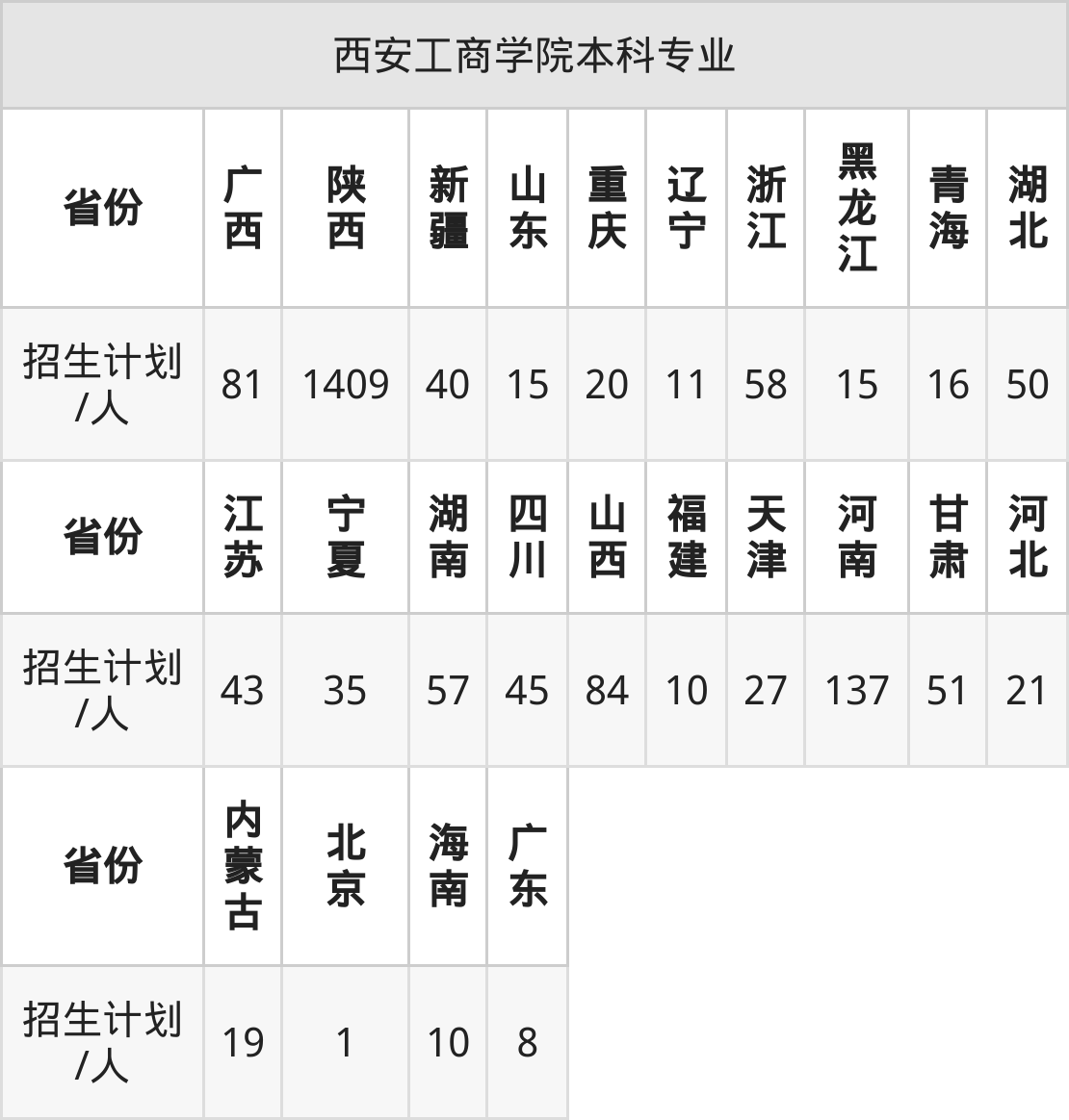 西安工商学院面向重庆(20人)、陕西(1409人)、甘肃(51人)、江苏(43人)、湖南(57人)、海南(10人)、山西(84人)等24个地区开展本科招生。其中天津招生批次为本科批B段,新疆、陕西、内蒙古、四川、河南招生批次为本科二批,其余省份为本科批。