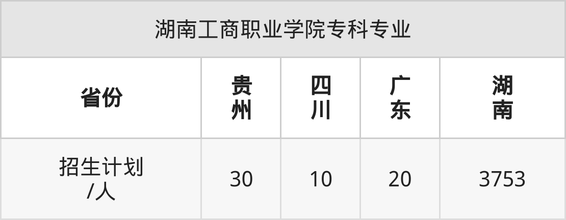 湖南工商职业学院面向贵州(30人)、四川(10人)、广东(20人)、湖南(3753人)开展专科招生。招生批次为专科批。