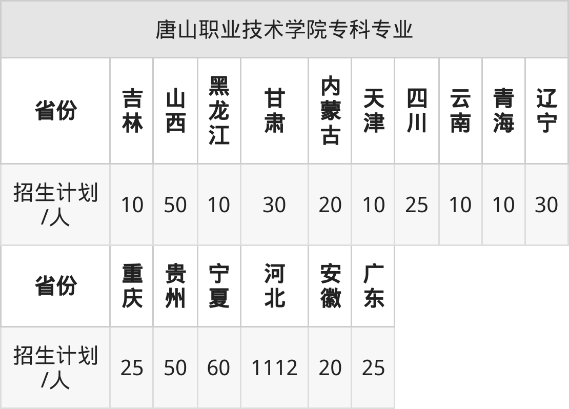 唐山职业技术学院面向山西(50人)、河北(1112人)、黑龙江(10人)、吉林(10人)、安徽(20人)、天津(10人)、甘肃(30人)等16个地区开展专科招生。招生批次为专科批。
