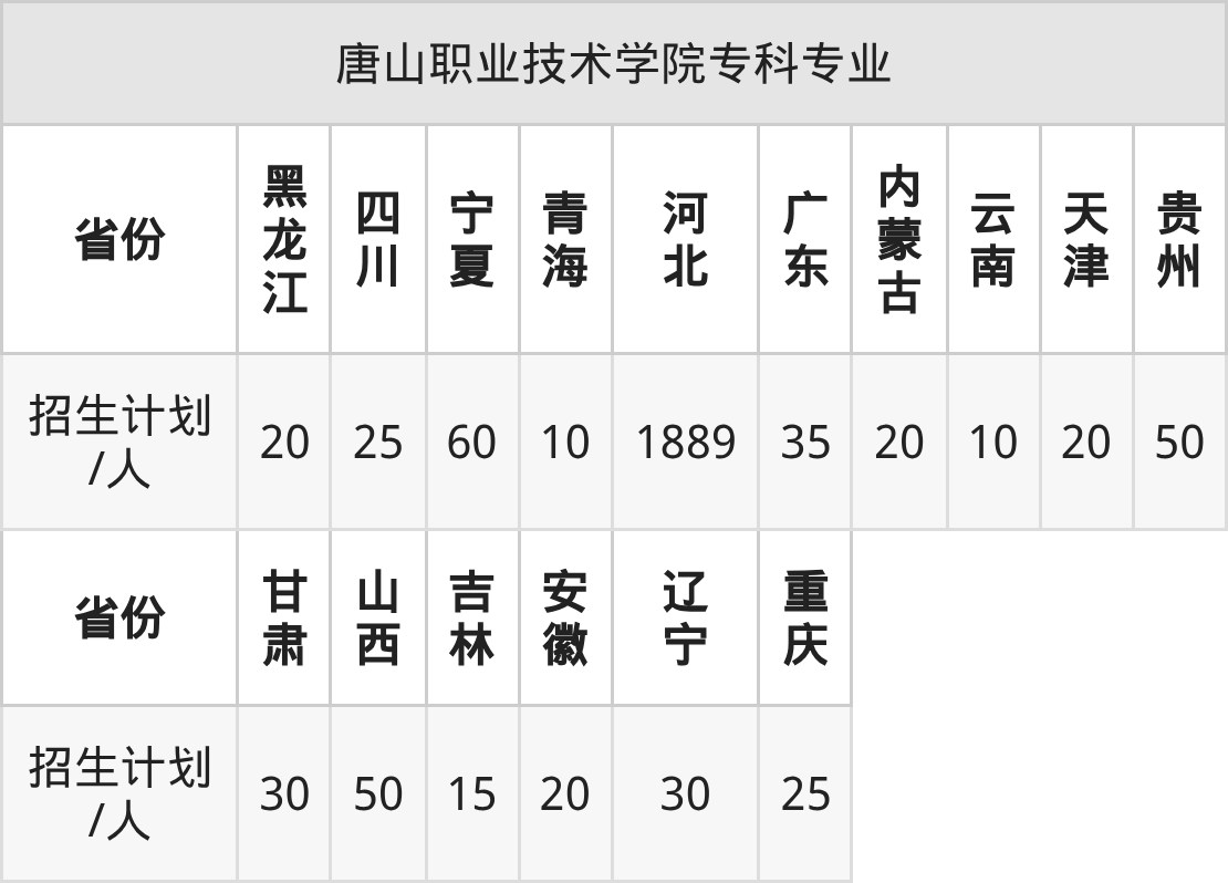 唐山职业技术学院面向宁夏(60人)、辽宁(30人)、重庆(25人)、吉林(15人)、贵州(50人)、天津(20人)、山西(50人)等16个地区开展专科招生。招生批次为专科批。