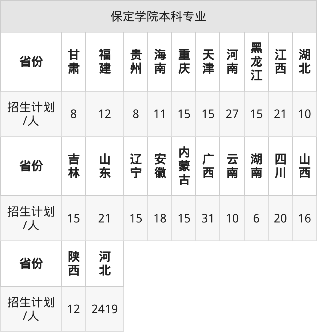 保定学院面向河南(27人)、贵州(8人)、山西(16人)、重庆(15人)、安徽(18人)、四川(20人)、陕西(12人)等22个地区开展本科招生。其中河北招生批次为本科提前批B,陕西、内蒙古、河南、四川招生批次为本科二批,其余省份为本科批。