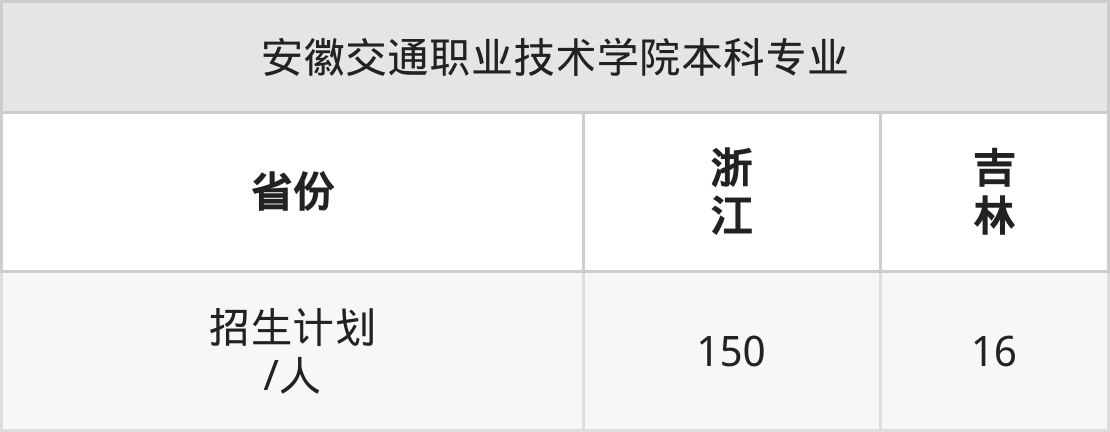 安徽交通职业技术学院面向吉林(16人)、浙江(150人)开展本科招生。招生批次为本科提前批A。