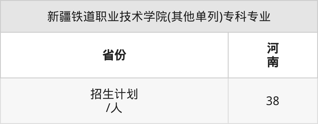 新疆铁道职业技术学院(其他单列)面向河南(38人)开展专科招生。招生批次为专科批。