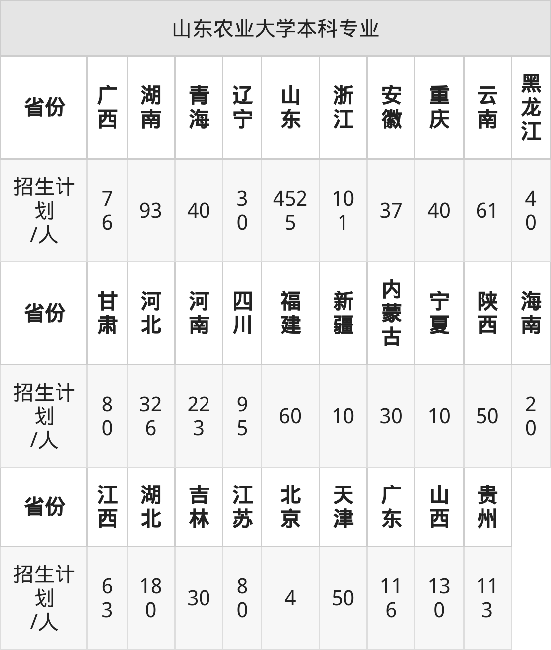 山东农业大学面向广东(116人)、陕西(50人)、江苏(80人)、山西(130人)、甘肃(80人)、河南(223人)、青海(40人)等29个地区开展本科招生。其中新疆、内蒙古、陕西、四川招生批次为本科二批,其余省份为本科批。