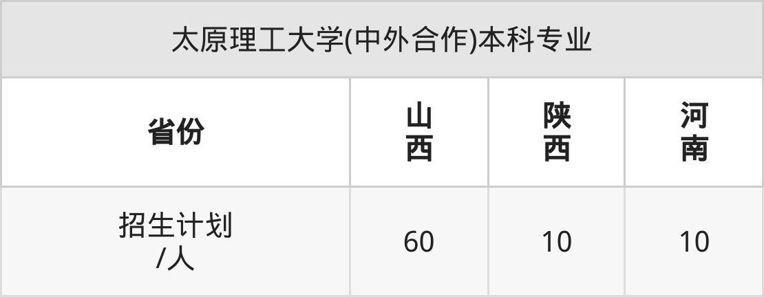 太原理工大学(中外合作)面向山西(60人)、陕西(10人)、河南(10人)开展本科招生。其中山西招生批次为第一批本科A1类,其余省份为本科一批。