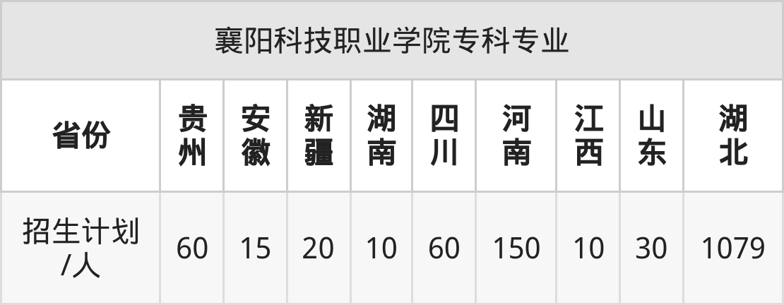 襄阳科技职业学院面向安徽(15人)、新疆(20人)、河南(150人)、湖北(1079人)、湖南(10人)、贵州(60人)、四川(60人)等9个地区开展专科招生。其中山东招生批次为二段,其余省份为专科批。
