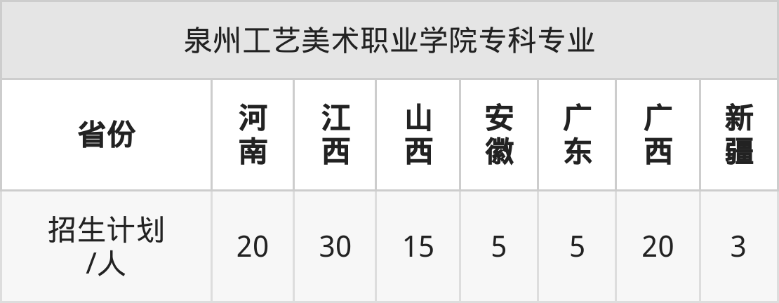 泉州工艺美术职业学院面向江西(30人)、山西(15人)、安徽(5人)、广东(5人)、广西(20人)、新疆(3人)、河南(20人)等7个地区开展专科招生。招生批次为专科批。