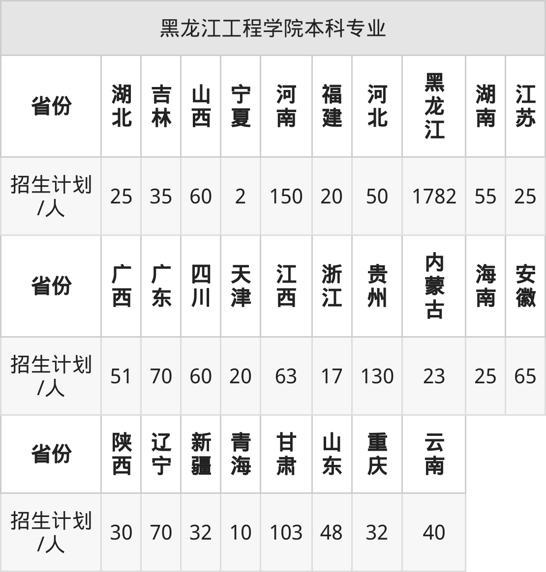 黑龙江工程学院面向湖南(55人)、四川(60人)、广东(70人)、黑龙江(1782人)、河南(150人)、云南(40人)、湖北(25人)等28个地区开展本科招生。其中宁夏招生批次为第二批本科,内蒙古、四川、陕西、河南、新疆招生批次为本科二批,其余省份为本科批。