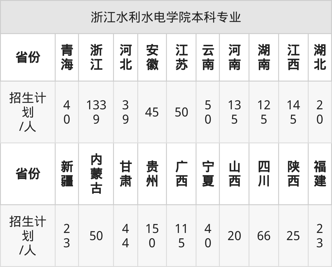 浙江水利水电学院面向河北(39人)、浙江(1339人)、四川(66人)、新疆(23人)、江苏(50人)、山西(20人)、福建(23人)等20个地区开展本科招生。其中宁夏招生批次为第二批本科,河南、四川、陕西、内蒙古、新疆招生批次为本科二批,其余省份为本科批。