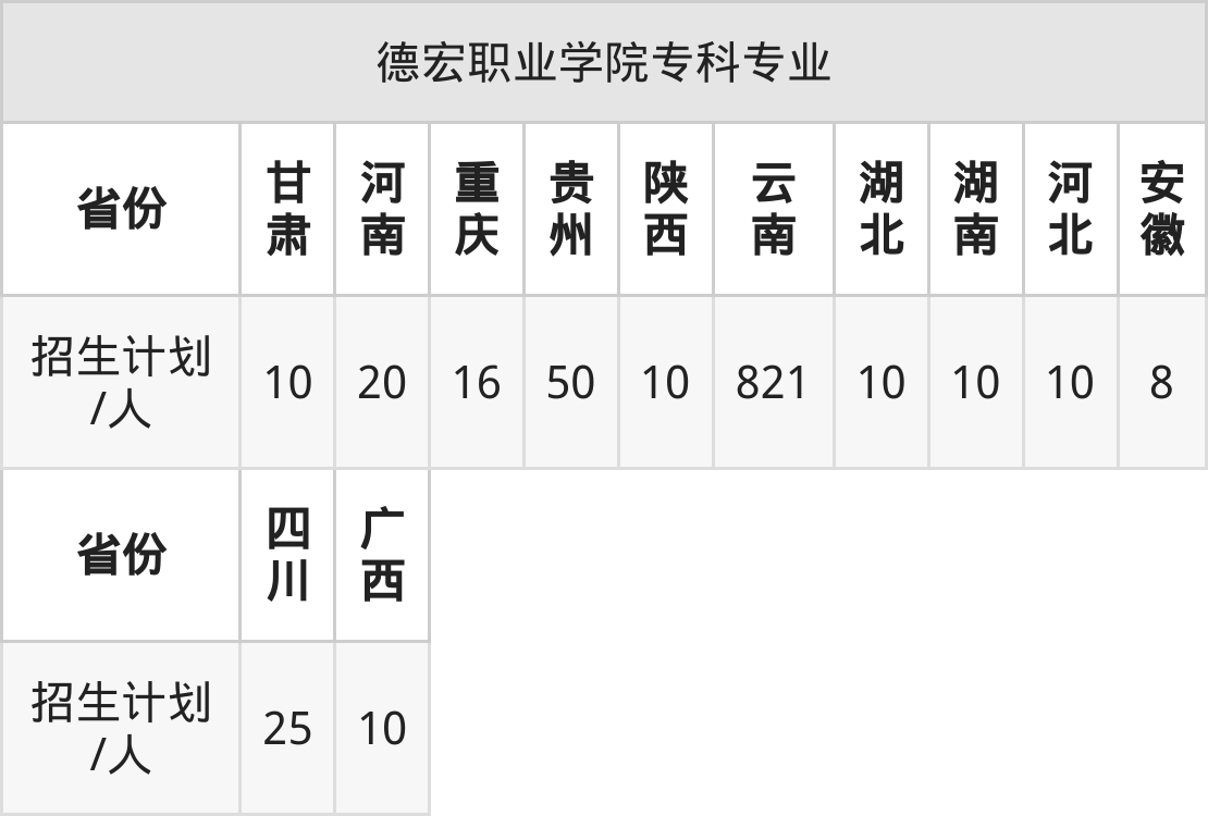 德宏职业学院面向广西(10人)、甘肃(10人)、云南(821人)、湖北(10人)、湖南(10人)、河北(10人)、安徽(8人)等12个地区开展专科招生。招生批次为专科批。