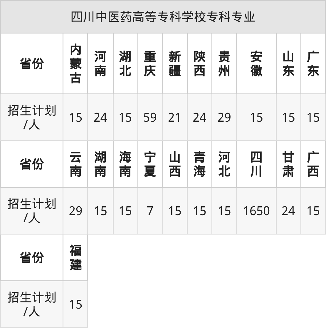 四川中医药高等专科学校面向贵州(29人)、广东(15人)、宁夏(7人)、重庆(59人)、山西(15人)、河北(15人)、安徽(15人)等21个地区开展专科招生。其中山东招生批次为二段,其余省份为专科批。