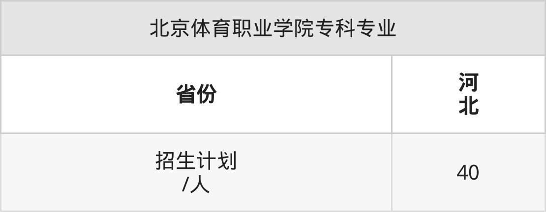 北京体育职业学院面向河北(40人)开展专科招生。招生批次为专科批。