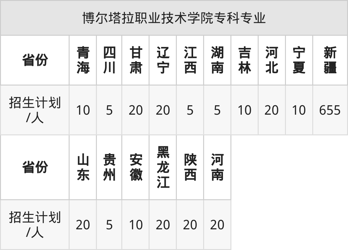 博尔塔拉职业技术学院面向新疆(655人)、贵州(5人)、河北(20人)、陕西(20人)、甘肃(20人)、江西(5人)、吉林(10人)等16个地区开展专科招生。其中山东招生批次为二段,其余省份为专科批。