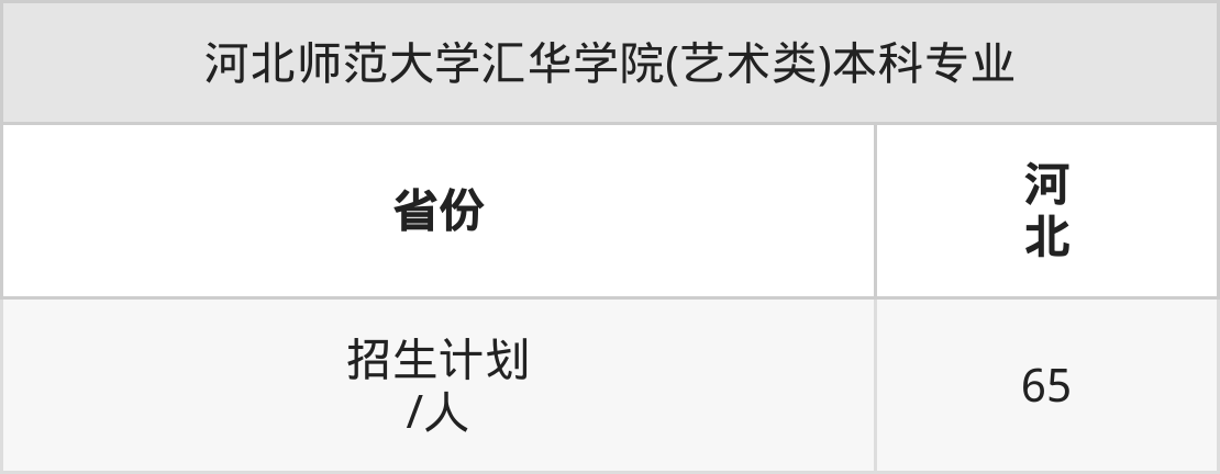 河北师范大学汇华学院(艺术类)面向河北(65人)开展本科招生。招生批次为本科批。