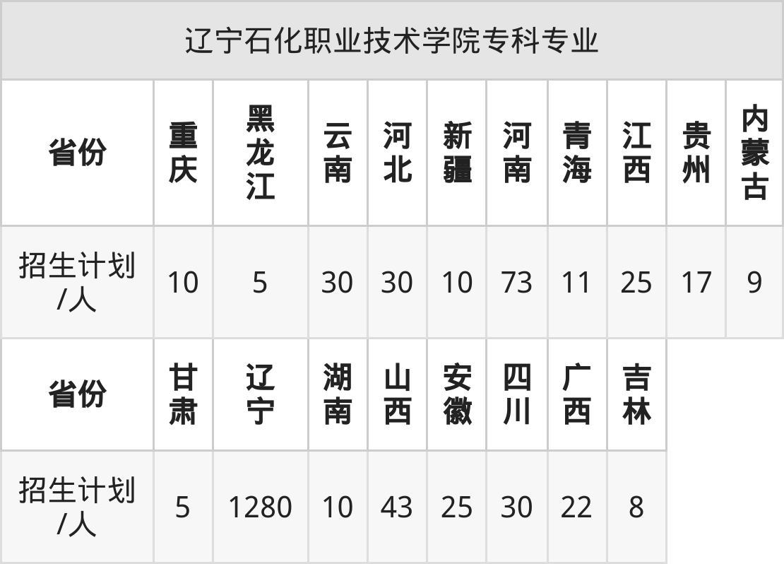 辽宁石化职业技术学院面向山西(43人)、内蒙古(9人)、河南(73人)、吉林(8人)、湖南(10人)、重庆(10人)、安徽(25人)等18个地区开展专科招生。招生批次为专科批。