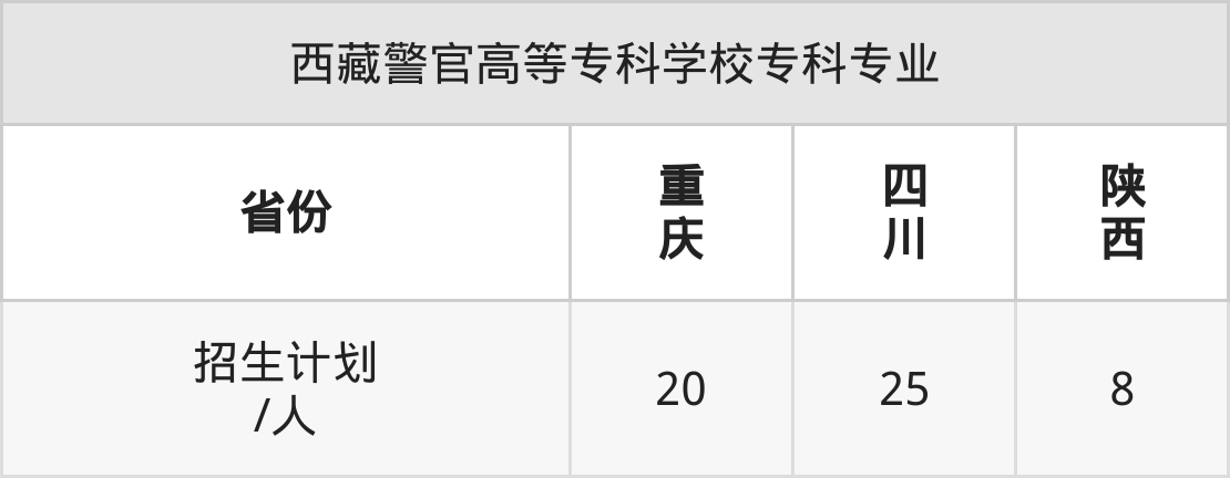 西藏警官高等专科学校面向重庆(20人)、四川(25人)、陕西(8人)开展专科招生。招生批次为专科批。