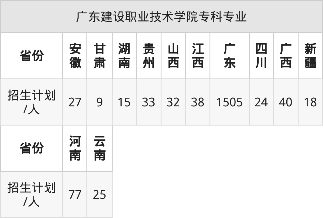 广东建设职业技术学院面向广西(40人)、甘肃(9人)、河南(77人)、安徽(27人)、广东(1505人)、新疆(18人)、云南(25人)等12个地区开展专科招生。招生批次为专科批。