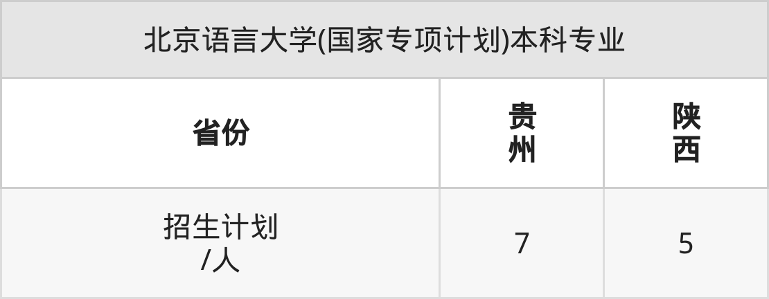 北京语言大学(国家专项计划)面向贵州(7人)、陕西(5人)开展本科招生。招生批次为本科批。