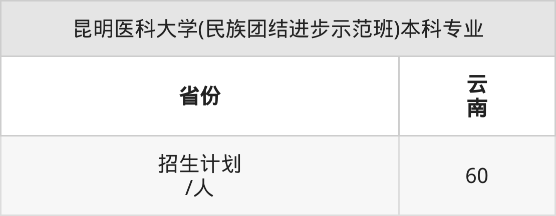 昆明医科大学(民族团结进步示范班)面向云南(60人)开展本科招生。招生批次为一本。