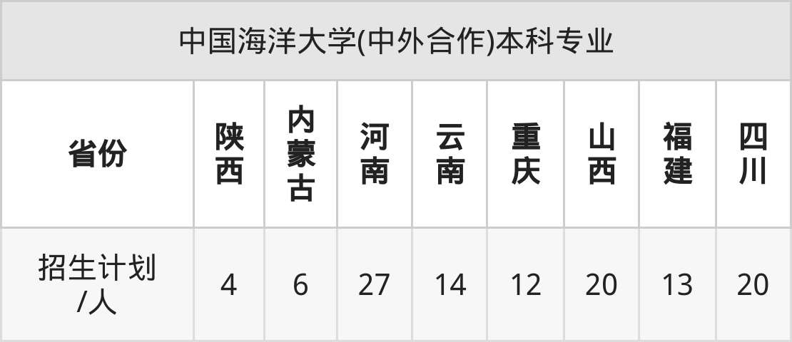 中国海洋大学(中外合作)面向内蒙古(6人)、河南(27人)、云南(14人)、重庆(12人)、山西(20人)、福建(13人)、四川(20人)等8个地区开展本科招生。其中山西招生批次为第一批本科A1类,重庆、福建招生批次为本科批,其余省份为本科一批。