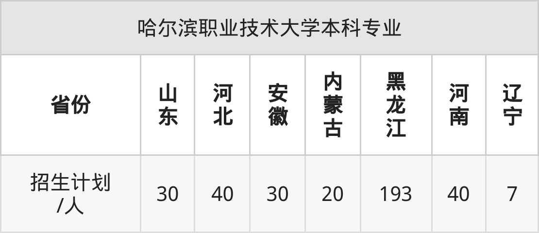 哈尔滨职业技术大学面向辽宁(7人)、山东(30人)、河北(40人)、安徽(30人)、内蒙古(20人)、黑龙江(193人)、河南(40人)等7个地区开展本科招生。其中山东招生批次为一段,内蒙古、河南招生批次为本科二批,其余省份为本科批。