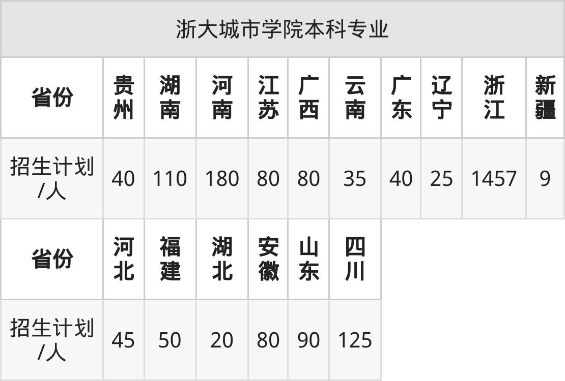 浙大城市学院面向浙江(1457人)、福建(50人)、河北(45人)、新疆(9人)、江苏(80人)、辽宁(25人)、湖北(20人)等16个地区开展本科招生。其中新疆招生批次为本科二批,河南、四川招生批次为本科一批,其余省份为本科批。