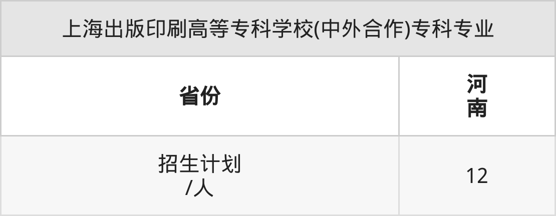 上海出版印刷高等专科学校(中外合作)面向河南(12人)开展专科招生。招生批次为专科批。