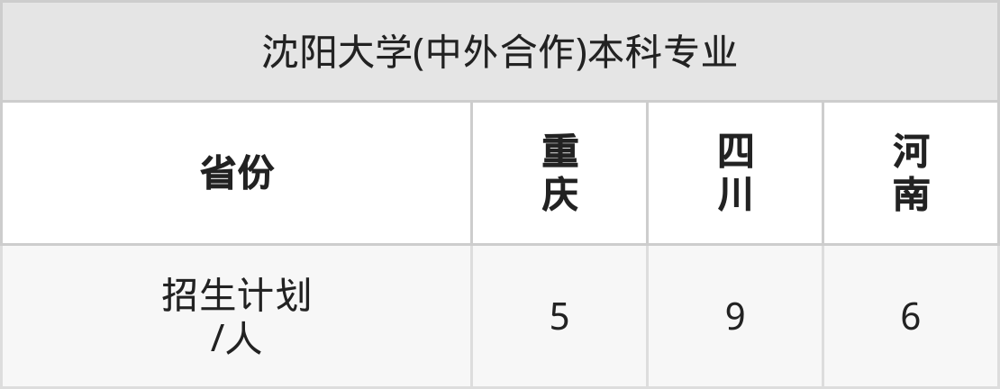 沈阳大学(中外合作)面向重庆(5人)、四川(9人)、河南(6人)开展本科招生。其中重庆招生批次为本科批,其余省份为本科二批。