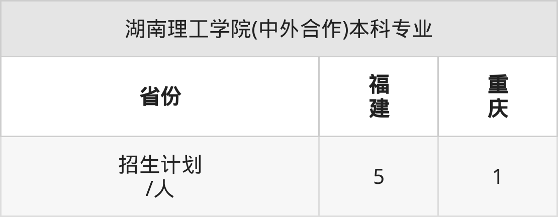 湖南理工学院(中外合作)面向福建(5人)、重庆(1人)开展本科招生。招生批次为本科批。
