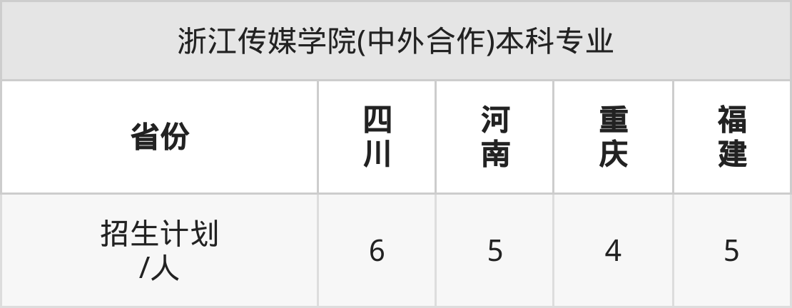 浙江传媒学院(中外合作)面向重庆(4人)、福建(5人)、四川(6人)、河南(5人)开展本科招生。招生批次为本科批。