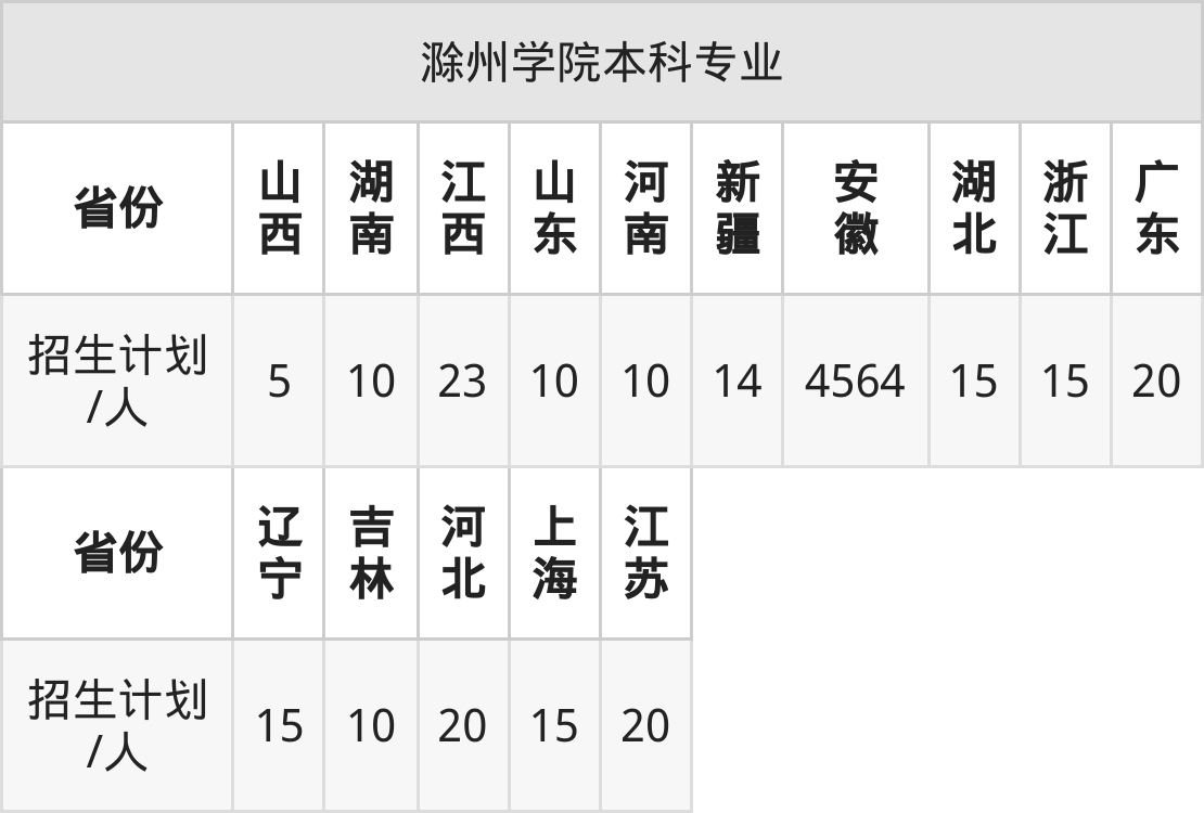 滁州学院面向安徽(4564人)、新疆(14人)、河南(10人)、湖北(15人)、广东(20人)、上海(15人)、辽宁(15人)等15个地区开展本科招生。其中新疆、河南招生批次为本科二批,其余省份为本科批。