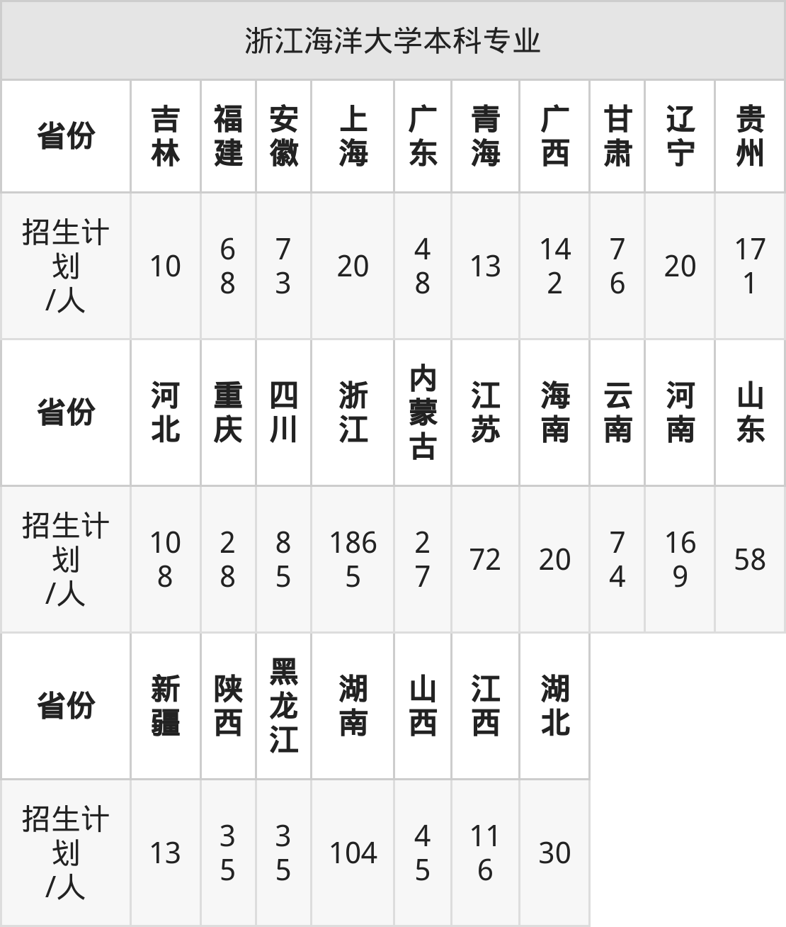 浙江海洋大学面向云南(74人)、上海(20人)、新疆(13人)、陕西(35人)、内蒙古(27人)、吉林(10人)、广东(48人)等27个地区开展本科招生。其中四川、内蒙古、新疆、陕西、河南招生批次为本科二批,其余省份为本科批。