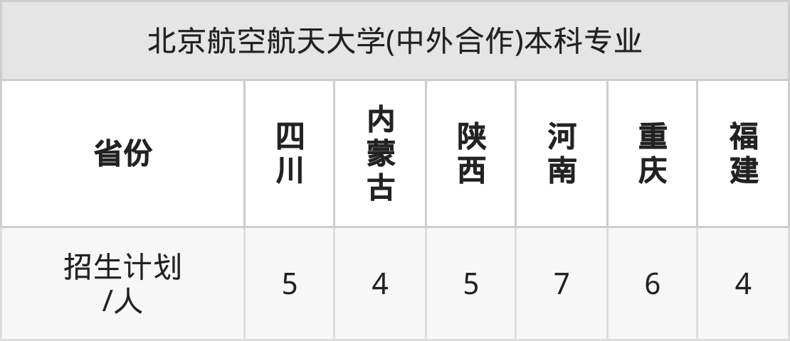 北京航空航天大学(中外合作)面向福建(4人)、四川(5人)、内蒙古(4人)、陕西(5人)、河南(7人)、重庆(6人)开展本科招生。其中福建、重庆招生批次为本科批,其余省份为本科一批。
