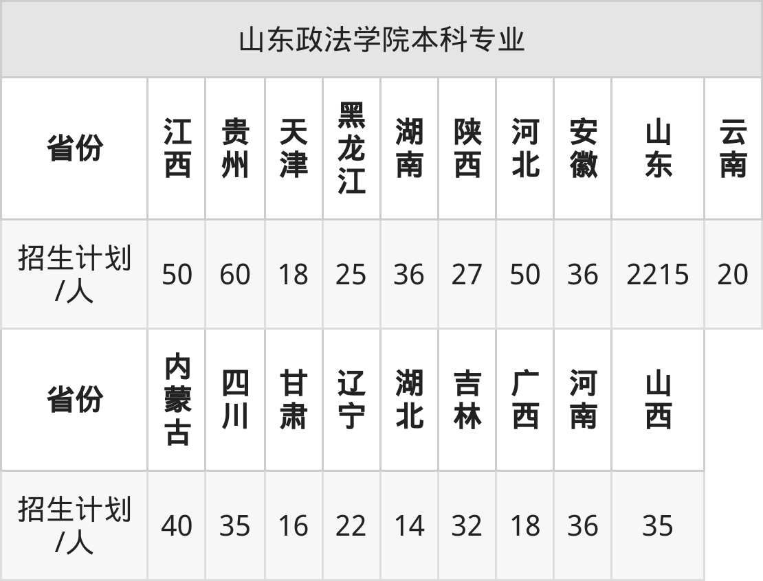 山东政法学院面向甘肃(16人)、云南(20人)、江西(50人)、山东(2215人)、湖北(14人)、河北(50人)、内蒙古(40人)等19个地区开展本科招生。其中云南招生批次为二本,河南、四川、陕西、内蒙古招生批次为本科二批,其余省份为本科批。