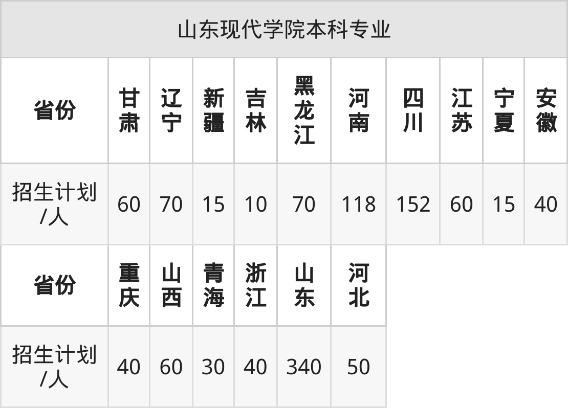 山东现代学院面向青海(30人)、吉林(10人)、甘肃(60人)、河南(118人)、山西(60人)、重庆(40人)、宁夏(15人)等16个地区开展本科招生。其中山西招生批次为第二批本科C类,四川、河南、新疆招生批次为本科二批,其余省份为本科批。