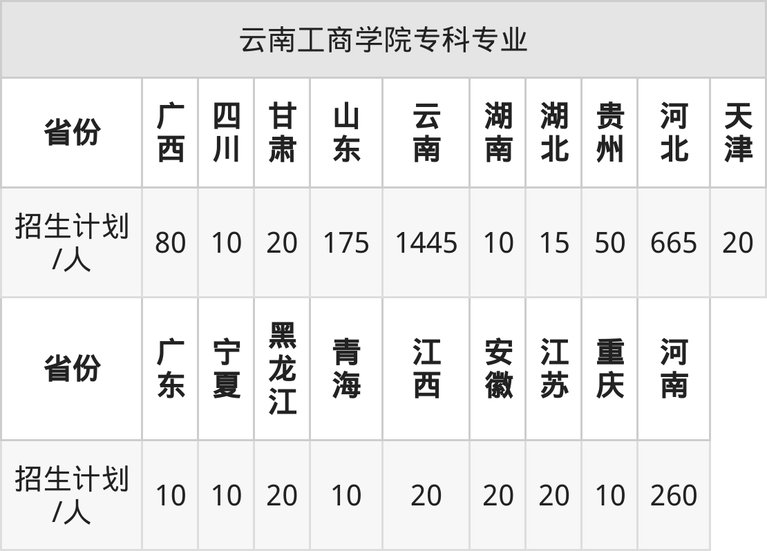 云南工商学院面向贵州(10人)、云南(1904人)、江西(20人)、重庆(20人)、四川(15人)、黑龙江(60人)、陕西(20人)等10个地区开展本科招生。其中宁夏招生批次为第二批本科,四川、陕西、河南招生批次为本科二批,其余省份为本科批。