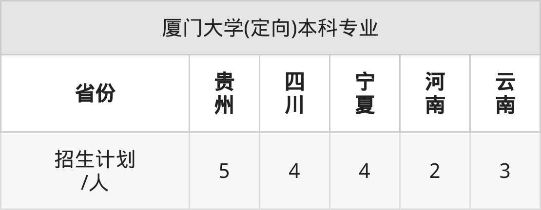 厦门大学(定向)面向云南(3人)、贵州(5人)、四川(4人)、宁夏(4人)、河南(2人)开展本科招生。其中贵州招生批次为本科批,其余省份为本科一批。