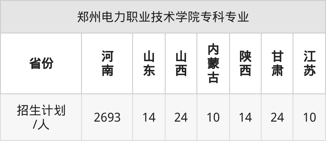 郑州电力职业技术学院面向山东(14人)、山西(24人)、内蒙古(10人)、陕西(14人)、甘肃(24人)、江苏(10人)、河南(2693人)等7个地区开展专科招生。其中山东招生批次为二段,其余省份为专科批。