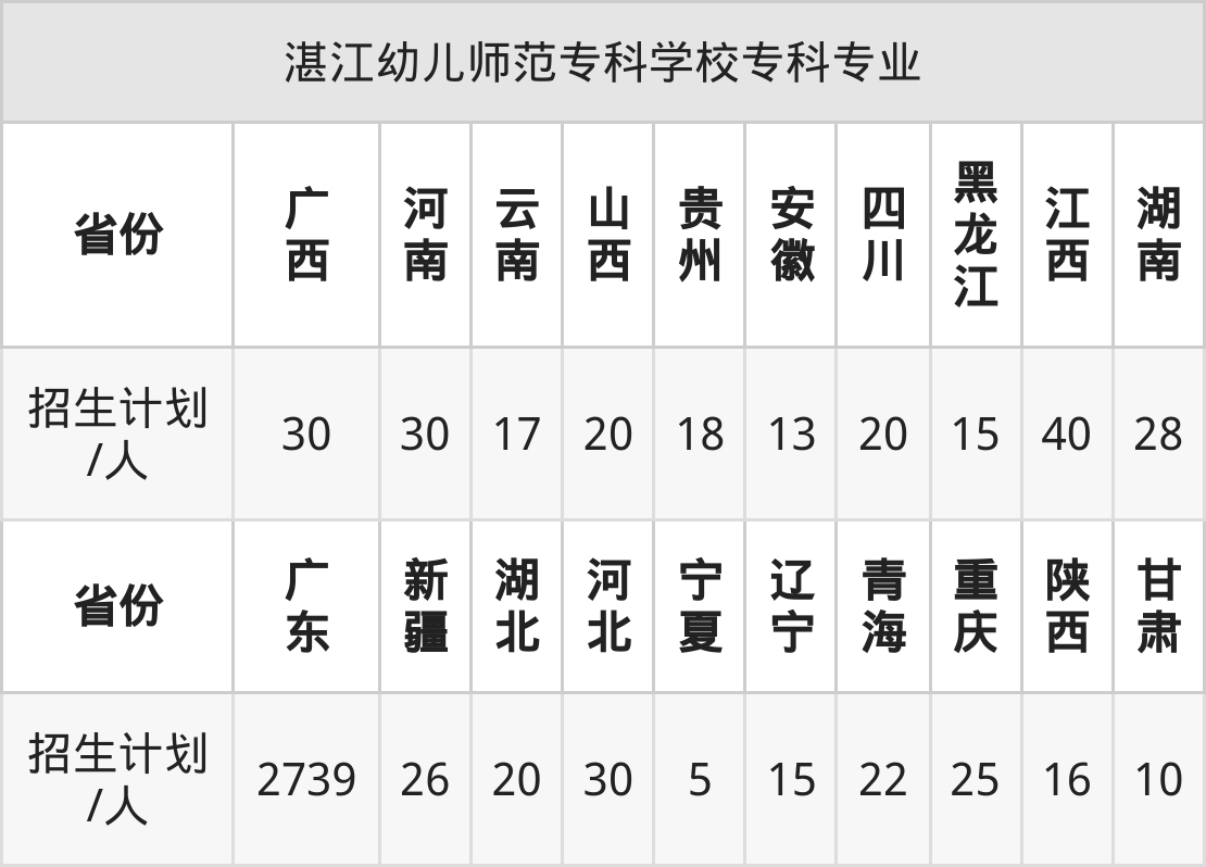 湛江幼儿师范专科学校面向河南(30人)、辽宁(15人)、山西(20人)、青海(22人)、江西(40人)、湖北(20人)、湖南(28人)等20个地区开展专科招生。招生批次为专科批。