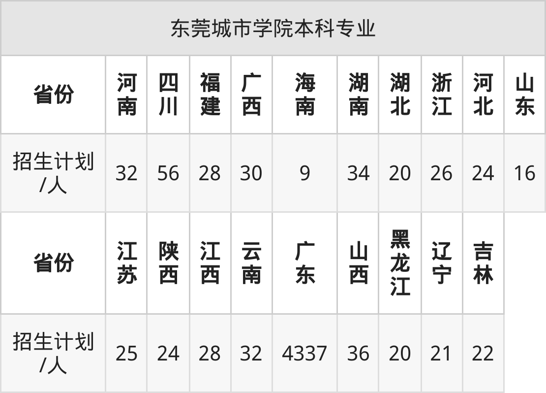 东莞城市学院面向福建(28人)、四川(56人)、吉林(22人)、江西(28人)、浙江(26人)、山东(16人)、湖北(20人)等19个地区开展本科招生。其中云南招生批次为二本,河南、四川、陕西招生批次为本科二批,其余省份为本科批。