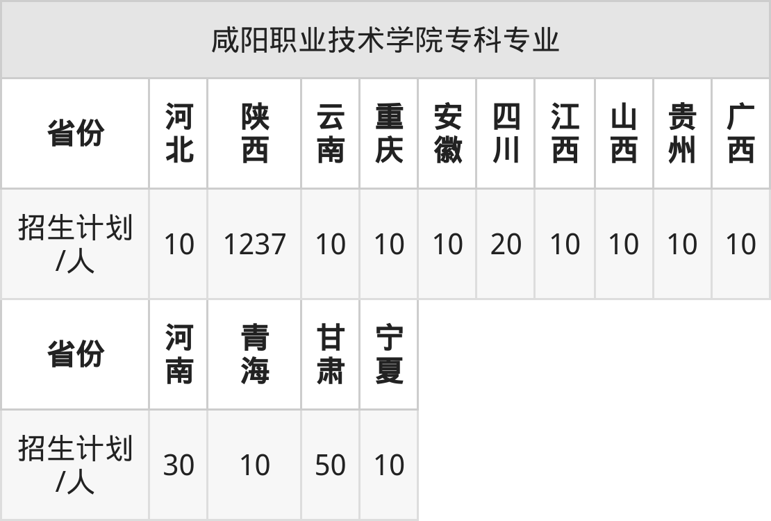 咸阳职业技术学院面向重庆(10人)、安徽(10人)、陕西(1237人)、云南(10人)、青海(10人)、山西(10人)、甘肃(50人)等14个地区开展专科招生。招生批次为专科批。